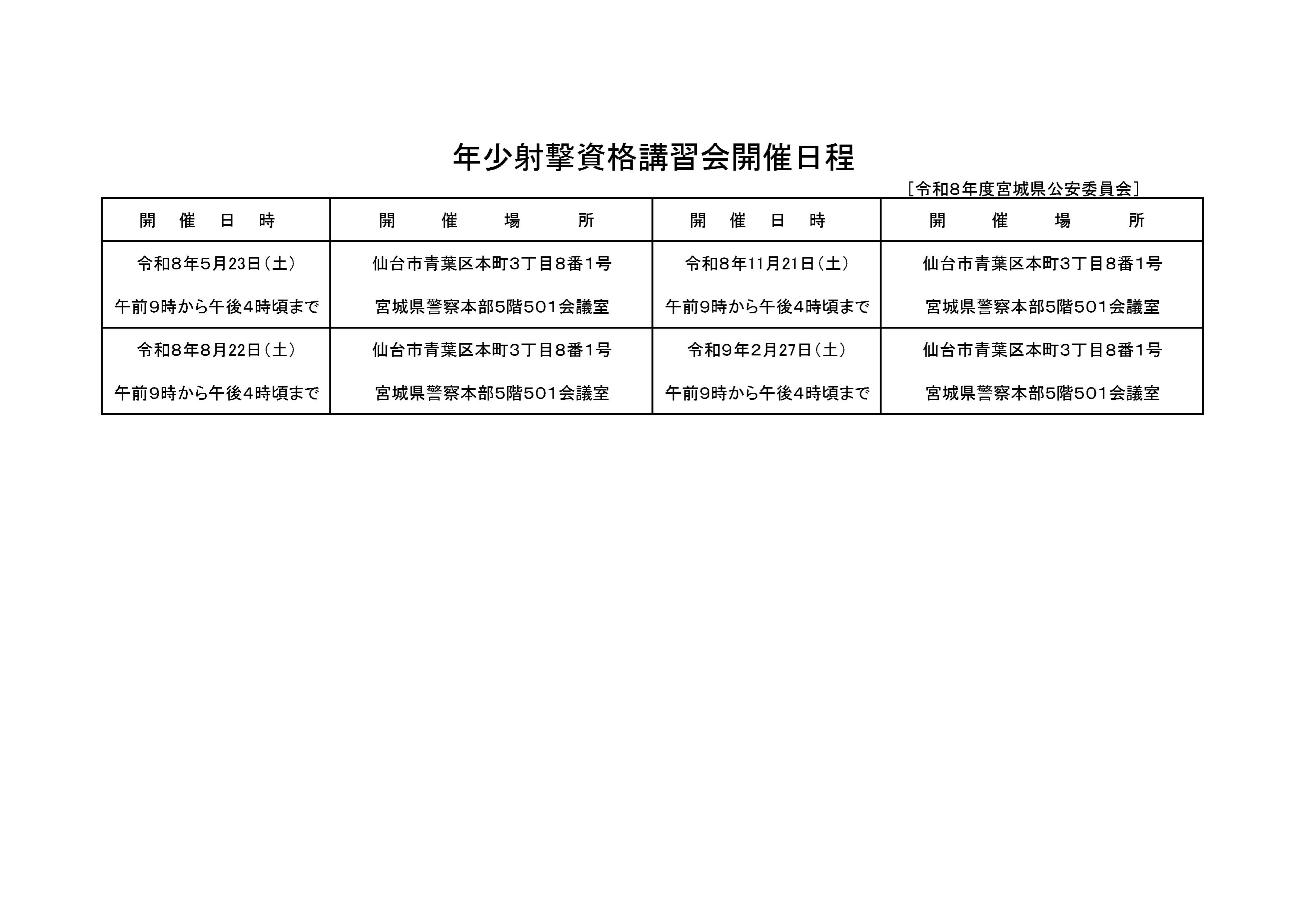 令和8年度の銃砲刀剣類所持等取締法第9条の14第1項の規定による、年少射撃資格の認定のための講習会は下記のとおり開催します。